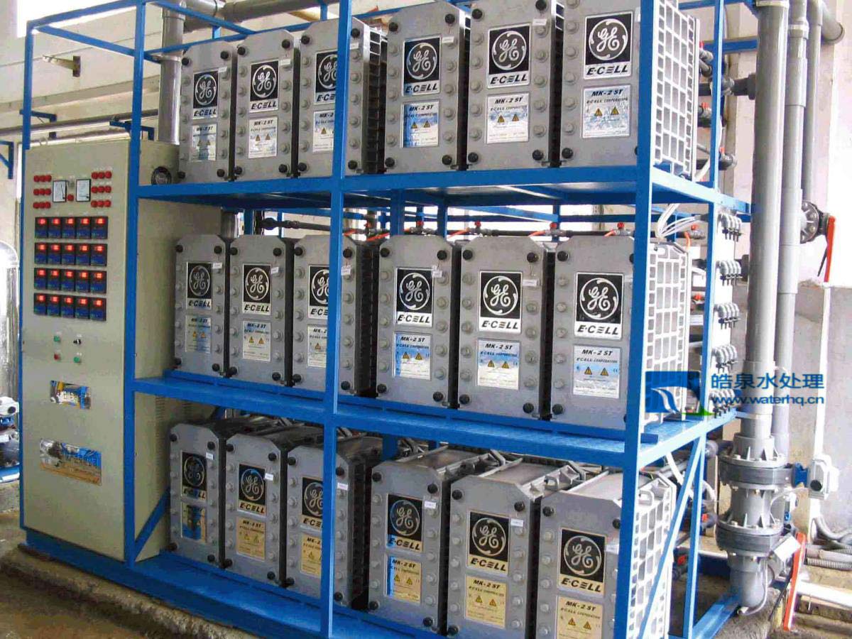 當(dāng)進(jìn)水中的 Na+及 CI-等雜質(zhì)離子吸咐到相應(yīng)的離子交換樹脂上時(shí),這些雜質(zhì)離子就會發(fā)生象普通混床內(nèi)一樣的離子交換反應(yīng),并相應(yīng)地置換出 H+及 OH-。一旦在離子交換樹脂內(nèi)的雜質(zhì)離子也加入到 H+及 OH-向交換膜方向的遷移,這些離子將連續(xù)地穿過樹脂直至透過交換膜而進(jìn)入濃水室。這些雜質(zhì)離子由于相鄰隔室交換膜的阻擋作用而不能向?qū)?yīng)電極的方向進(jìn)一步地遷移,因此雜質(zhì)離子得以集中到濃水室中,然后可將這種含有雜質(zhì)離子的濃水排出膜堆。