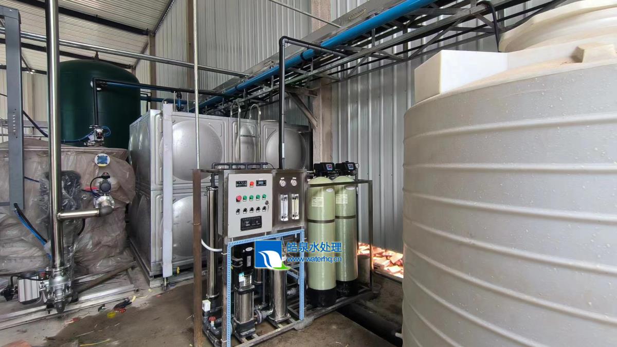 原水→原水泵→活性炭過濾器→軟化器→保安過濾器→高壓泵→反滲透設(shè)備→純水箱→取水點